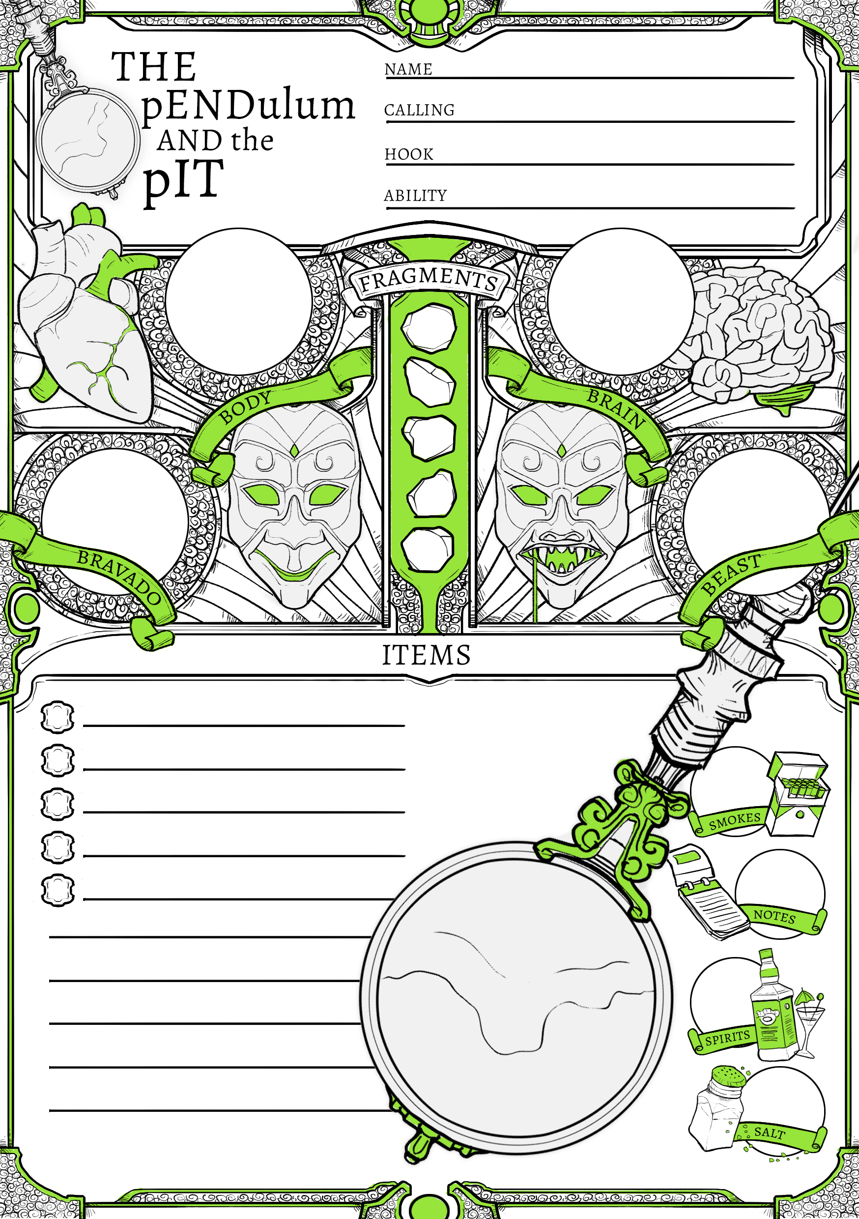 THE pENDulum AND the pIT is played as the world grows closer to another dark age. There are two roles, the singular Eye and the Seekers. The Eye watches, holding no bias, witnessing and narrating the actions of the Seekers while they try their best to delay the inevitable for a little longer.